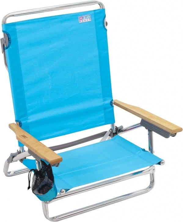 Light weight, 5-position, lay flat beach chair with shoulder strap.
