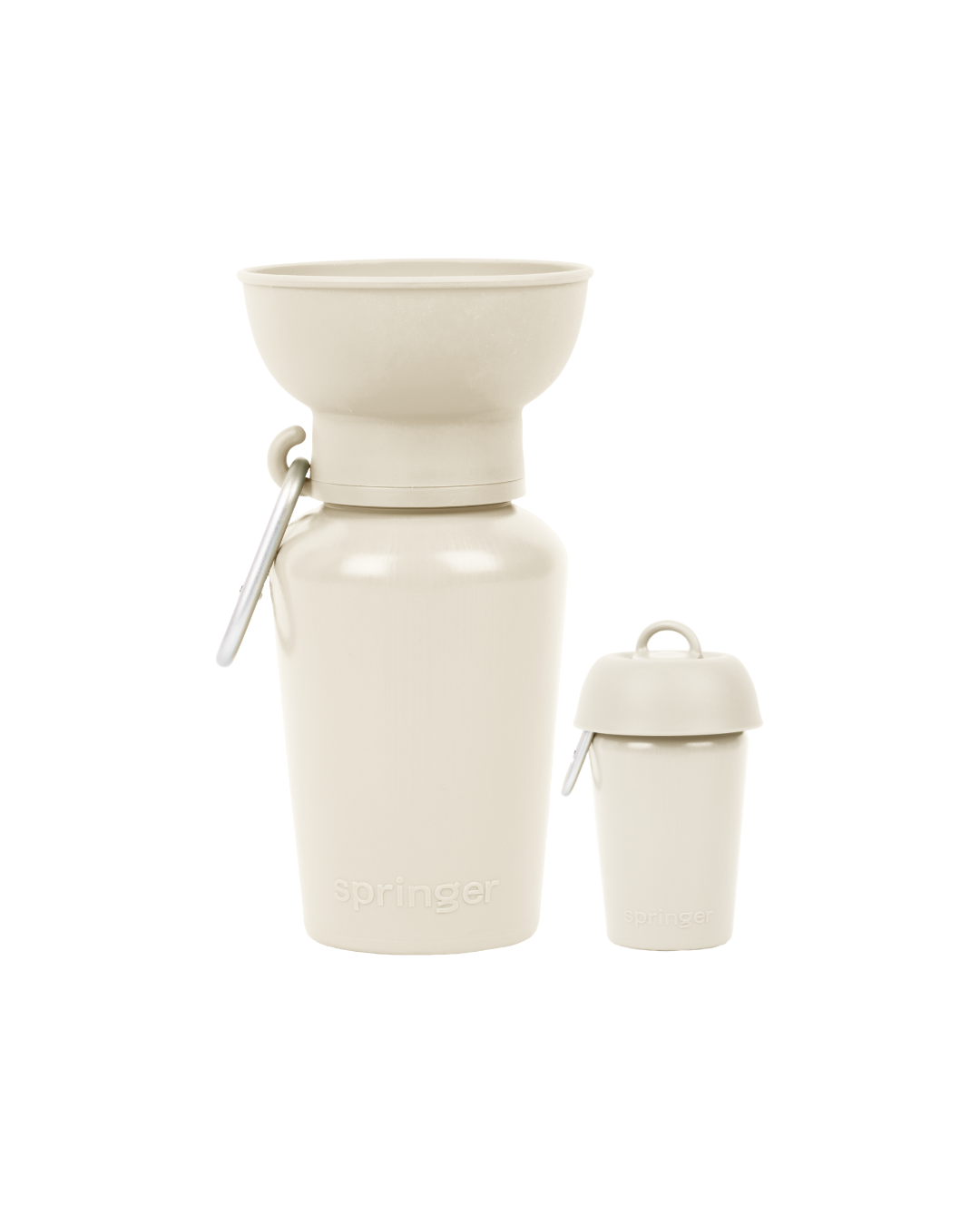 Award-Winning Springer Flip Dog Travel Water Bottle - As Seen on Shark Tank & Oprah's Favorite Things! Never worry about your dog's hydration again. Whether you're hiking mountain trails, exploring beaches, or taking road trips, keeping your dog properly hydrated shouldn't be a constant concern. The Springer Flip Dog Travel Water Bottle gives you instant on-the-go hydration anywhere your adventures take you with the ultimate space-saving design. Our innovative silicone flip-top bowl flips up to reveal a drinking bowl for your dog, then collapses down for compact travel. Simply flip up the bowl, squeeze the bottle for fresh water, and when your dog is done, flip it down for mess-free, compact storage. No spills, no bulk, no worries! Over 350,000+ dog owners trust this award-winning solution for reliable hydration on every adventure. Complete with a carabiner for easy clipping to your bag or leash.