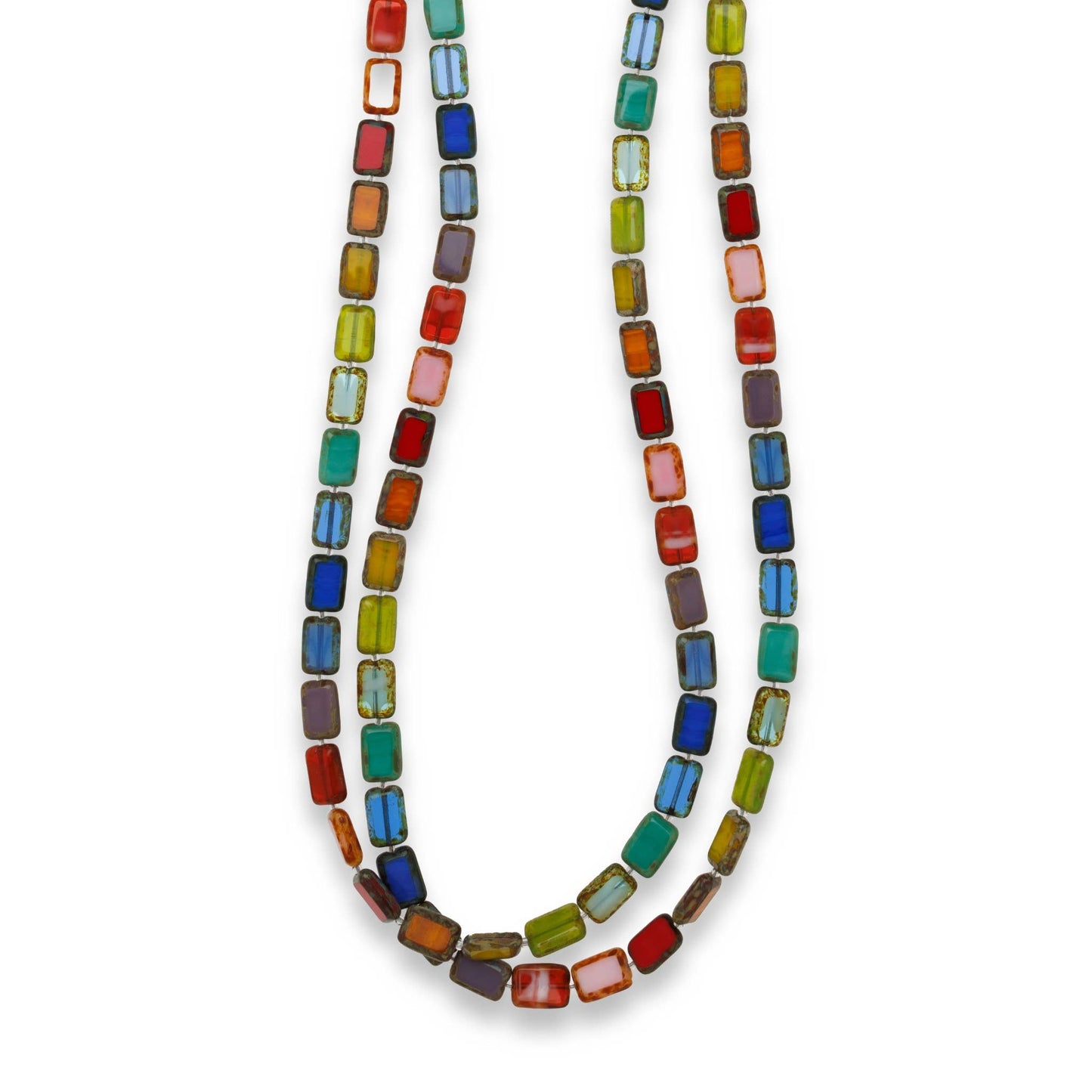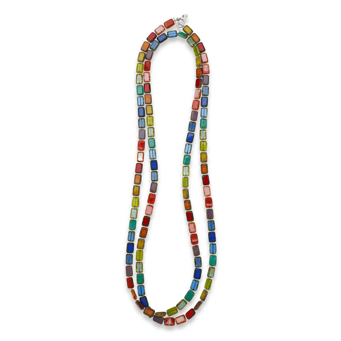 Celebrate every day with our NEWEST addition to the trilogy collection. This long beaded strand features a multicolored assortment of rectangular glass beads in rainbow order– reminiscent of the path on a game of candyland (that’s what it reminds me of!). Wearing this necklace is guaranteed to bring your customers joy. Meticulously handcrafted from 116 colorful glass beads in rainbow order– this necklace is a sure statement piece and includes every color of the rainbow: Red, Orange, Yellow, Green, Aqua, Turquoise, Blue, Indigo, Purple, and Pink!