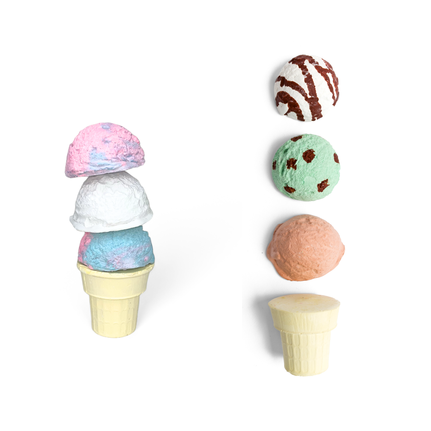 3 ice cream scoops (2 pink and blue swirled, 1 white) and 1 yellow cone.