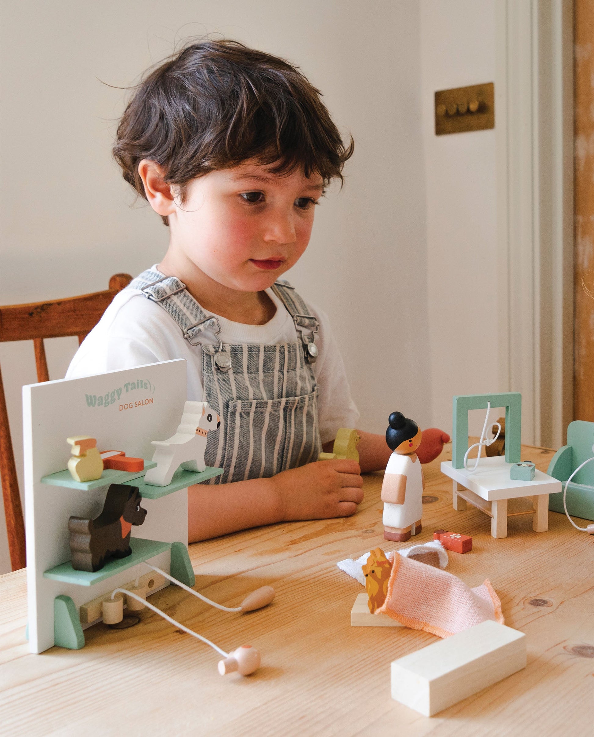 Welcome to the Waggy Tails dog grooming play set, where our lady groomer cares for and pampers 7 different breeds of dogs. Breeds include: Giant Poodle, Husky dog, Beagle, Bull Terrier, Dachshund, Shih Tzu, and Scotty dog. Included in the set is a washing area with shower head and three towels, a grooming table with brush, a self-standing back wall with plug in hair dryer and clippers, 3 bottled dog products and a winning trophy, 3 podiums to display the groomed dogs, a blanket, 2 bones in a bowl, and a little poo! Scaled to our dolls house world, combine with our other pet sets and dolls for extensive imaginative playtime.